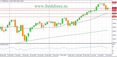 Текущая ситуация на американском фондовом рынке вносит смуту в ряды инвесторов. С одной стороны долгосрочный восходящий тренд всё еще в силе и техническая коррекция на минувшей недели представляет хорошие возможности для открытия длинных позиций. С другой стороны, макроэкономические отчеты по розничным продажам и потребительской уверенности не продемонстрировали сильных данных, что в совокупности с грядущим заседанием ФРС США будет выступать сдерживающим фактором для “бычьих” настроений и мы увидим дальнейшее снижение котировок в область 1915. На этом фоне, участникам торгов следует присматриваться к длинным позициям во фьючерсе на фондовый индекс S&P500 после заседания FOMC, которое состоится в среду 18 июня.