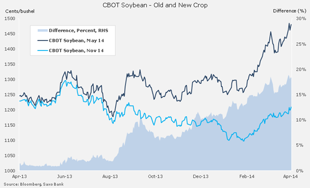 Торговля на ключевых рынках зерна была разнонаправленной: рост кукурузы и пшеницы был отчасти компенсирован потерями на рынке соевых бобов. Кукуруза подскочила в цене из-за постоянных задержек с весенним посевом по причине влажной, прохладной погоды на Среднем Западе США. По состоянию на 20 апреля посажено всего 6% кукурузы по сравнению со средним пятилетним значением 14%. Дальнейшие задержки могут привести к тому, что под соевые бобы будет отведена бóльшая площадь, потому что эта культура сеется позднее. Кроме того, в Китае спрос на соевые бобы упал, в результате чего южноамериканские грузы были перенаправлены в США. Все эти факторы помогли снять восходящее ценовое давление, которое было создано сильнейшим дефицитом за многие десятилетия. Пшеница восстановила позиции после распродажи в период Пасхи, так как украинский кризис поставил под угрозу урожай в этом важнейшем сельскохозяйственном регионе, в то время как на южных плантациях США недостаток осадков уменьшает потенциальную урожайность озимых.