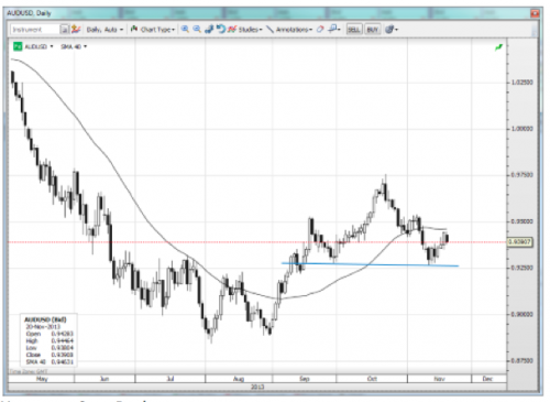 Поздним вечером Бен Бернанке выступил с речью, в которой отметил, что процентные ставки будут оставаться на низком уровне еще долгое время после того, как Федрезерв ограничит объем покупок активов, и даже «очень долгое время после того», как уровень безработицы опустится ниже порога в 6,5%. По какой-то причине, рынок решил, что эта новость заслуживает реакции и продал американский доллар прежде, чем валюта смогла отыграть большую часть движения ближе к концу азиатской сессии этим утром. На данном этапе рыночный прогноз по первому шагу Федрезерва касательно процентных ставок в будущем оказался ошибочным и теперь носит теоретический характер. Начнем с главного — давайте волноваться относительно сокращения, а не процентных ставок. Подумаем, дернет ли Бернанке впервые за рычаг сокращения в декабре (рынок в этом очень сомневается) или в январе. Возможен второй вариант, однако многие рассматривают и март. Все это сильно зависит от данных, поскольку Федрезерв отныне и впредь придерживается политики отставания.