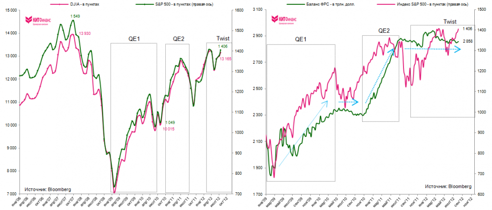 Спрос на рискованные активы, тем временем, растет на ожиданиях запуска новых стимулирующих программ, и, прежде всего, от американских монетарных властей. Тем не менее, мы считаем вероятность запуска третьей по счету программы количественного смягчения (QE3) в ее традиционной форме выкупа активов на баланс ФРС крайне низкой.