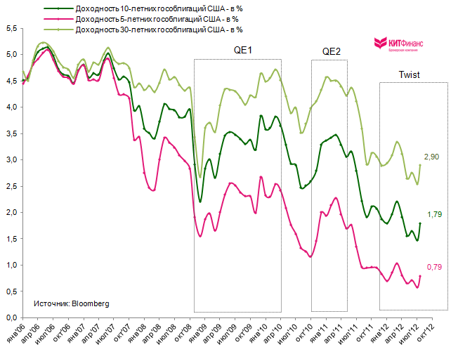 Ставки находятся н/ем более программа Twist продлена до конца 2012 г. Напомним, что Twist не является программой ко/ения и не приводит к расширению баланса ФРС. Суть программы заключается в ребалансировке портфеля ФРС в пользу продажи бумаг с короткой дюрацией (до 5 лет) и покупки долгосрочных гособлигаций с целью давления на уровень доходностей длинного конца кривой UST, на которые ориентируются ставки по долгосрочным кредитам, ипотеке и т.п.