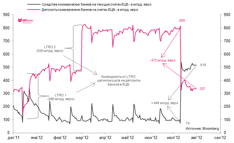 Напомним, что в ре/ставки по депозитам овернайт на счетах ЕЦБ (ECB Eurozone Liquidity Recourse to the Deposit Facil/оммерческие банки за короткий срок вывели с депозитов почти на 450 млрд. евро, переведя львиную долю этих средств на свои текущие счета, открытые в том же ЕЦБ (ECB Eurozone Liquidity Current Account Holdings) – ликвидность так и не покинула стен европейского регулятора. Сложив объем средств коммерческих банков на депозитах ЕЦБ и объем средств на текущих счетах, получим 900 млрд. евро – примерно этому объему средств была равна “огневая” мощь LTRO1+LTRO2.