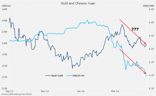 Перед Пасхой Всемирный золотой совет (World Gold Council, WGC) опубликовал прогноз о том, что в 2014 году спрос на золото в Китае, скорее всего, не изменится после прироста в 2013 году. Однако более серьезное беспокойство у инвесторов, рассчитывающих на то, что китайский спрос компенсирует падение спроса со стороны международных институциональных инвесторов, вызывает прогноз Совета о том, что в финансовых сделках в растущем теневом банковском секторе Китая задействовано более одной тысячи тонн золота. Правительство недавно позволило курсу юаня понизиться, и некоторые участники рынка рассматривают этот шаг как попытку ограничить нестандартные практики кредитования, когда полезные ископаемые, например золото и медь, используются в качестве обеспечения в целях получения иностранных долларовых кредитов, которые затем конвертируются в юани и инвестируются на внутреннем рынке. При снижении курса юаня стоимость таких долларовых кредитов увеличивается, и поэтому на рынке все громче звучат заявления о закрытии сделок и продаже активов, обеспечивающих кредиты.