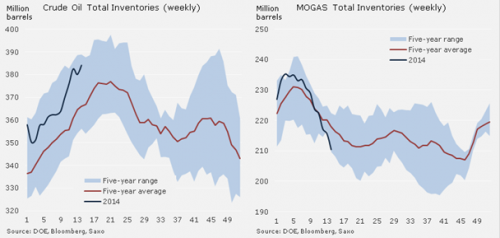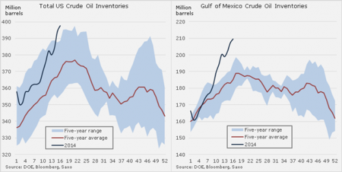 Запасы сырой нефти в США достигли рекордного значения на уровне 397,6 млн баррелей. Это самый большой объем нефти с момента начала ведения статистики Службой энергетической информации (Energy Information Administration) в 1982 году. Благодаря усовершенствованию трубопроводной инфраструктуры между регионами добычи сланцевой нефти в центральной части США и НПЗ на побережье Мексиканского залива запасы увеличились до 209,6 млн баррелей. Несмотря на то, что этот район считается крупнейшим в мире нефтеперерабатывающим узлом, если нефть продолжит поступать в таком большом количестве, то появится угроза переполненности хранилищ, что в конечном итоге либо приведет к сокращению поставок из Кушинга (крупного центра хранения и пункта поставки нефти сорта WTI), либо к уменьшению импорта, который сейчас равен 7,8 млн баррелей в сутки и приближается к среднему за 52 недели значению. Любой из сценариев развития событий негативно отразится на стоимости сырой нефти, и, если только не произойдет новая вспышка агрессии на Украине, цены на нефть подвержены падению в этом квартале.
